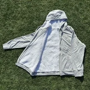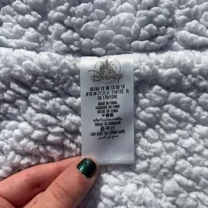 Heathered knit fabric. Furry fleece ''sherpa'' lining. Shell/sleeve lining 60% cotton / 40% polyester. Body/hood lining polyester. Only worn a couple of time. Sold out online. Bought at California Disneyland.