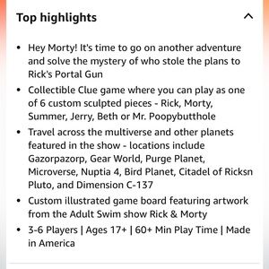 • Collectible Clue game where you can play as one of 6 custom sculpted pieces - Rick, Morty, Summer, Jerry, Beth or Mr. Poopybutthole