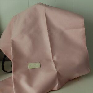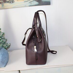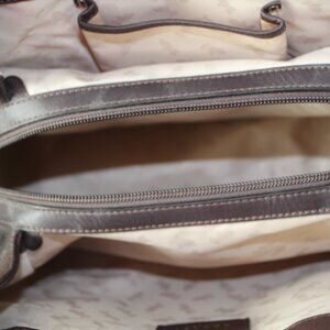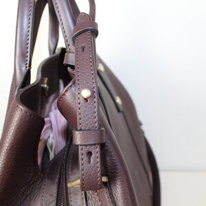 Smooth Grainy Brown leather with tan fabric lining. Rolled top handles with gold stud features and hanging dog charm. An adjustable removeable shoulder strap with gold hardware. Allows the satchel to be used as a shoulder bag or crossbody. The bag has triple compartments with the center zipped compartment. One pocket has the logo plate while the third has a slip pocket and a phone pocket. Top snap closure The back of the bag has a fully lined pocket. The bag measures 13 inches wide, 10 Inches in height, and 5 inches deep. The handle drop is 4 inches. Pink cloth dust bag. This new bag is from a pet free smoke free home.