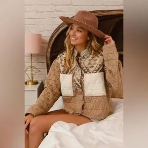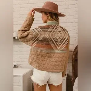 Tan Mixed Aztec Tribal Raw Hem Puffer stitch cotton Quilted Zip Jacket coat