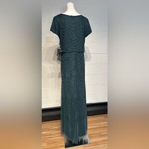 Classic charm and effortless sparkle team up in this gorgeous evening gown featuring a beaded blouson bodice that creates a flattering look. The beaded design continues down a long flowing skirt. Short sleeves and a scoop neck complete this pretty dress