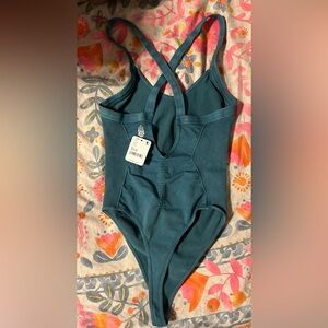 Elevate your wardrobe with this stunning Free People Good Karma Bodysuit in a rich teal hue. This one-piece style is perfect for any occasion, whether you're dressing it up with a skirt or wearing it casually with jeans.