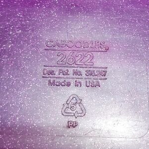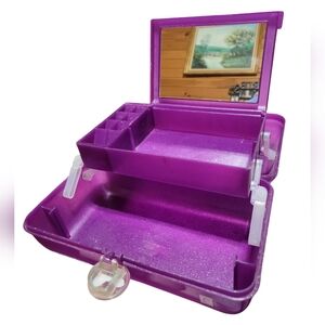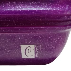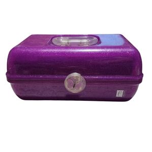 A purple with silver sparkle Caboodles case with Caboodles logo on the front and an acrylic clear clasp and handle. It has a lift up box with a flip up mirror top, a small loose tray, and a lipstick holder. The bottom of the case has lots of room for bulkier items.