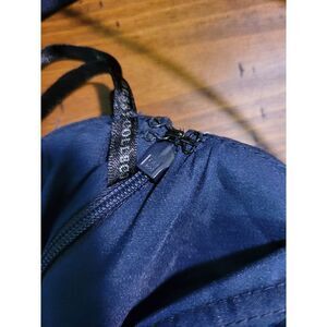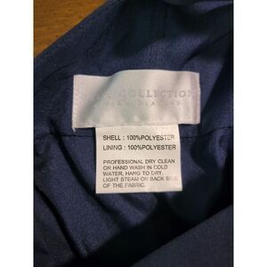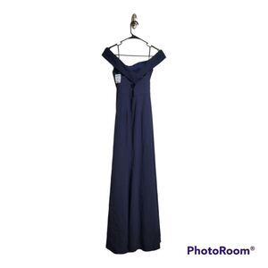 This is a navy blue Dessy Collection off the shoulder trumpet skirt gown with a slit at the left thigh. This dress measures 56 inches in length, 13 inches from armpit to armpit, and 12 inches at the waist. This dress is new with tags and no flaws.