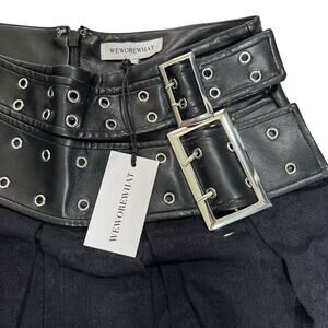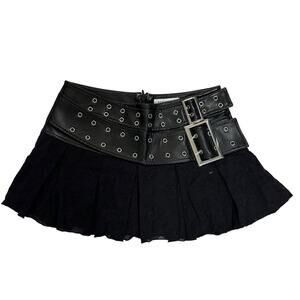 This micro mini combines a pleated lace skirt with a vegan leather waistband featuring buckle belt straps. It has built-in shorts for coverage and a hidden back zip closure.