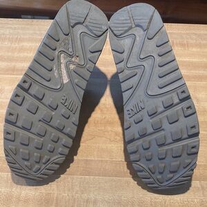 A nice pair of kids Nike Air Max sneakers. Will fit a woman’s 7. Black with white swoosh. Some marks on back of heel as seen on the white part of the heel. Nice tread. Clean. 2014