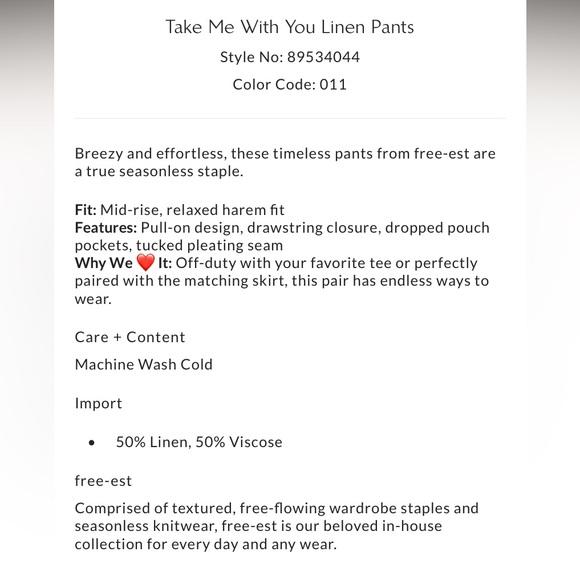NWT, Free People Take Me With You Linen Pants, in Niagara River, color no longer available. Size small. These comfortable boho pants will be great for travel, summer, spring, or being comfortable yet stylish around the house. The stock photos are a different color beczuse this gorgeous turquoise is no longer available in stores or online. Brighten up any time of year with these cozy, linen, airy pants. Smoke Free Home, one hypoallergenic (no shed) dog who is not is not allowed in the Posh closet.