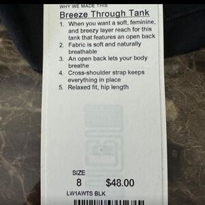 NWT Lululemon Breeze Through Tank Size 8