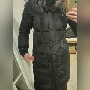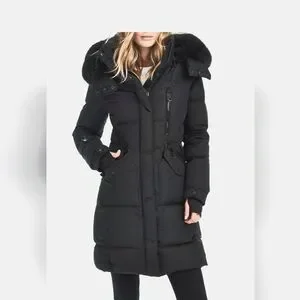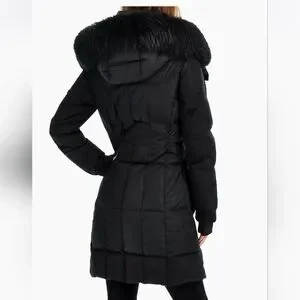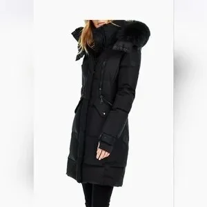 This wind-and-water resistant quilted down-filled coat from Sam. features a removable hood with real racoon fur, front zip and snap-flap pockets, and a front zip closure with a snap storm placket.