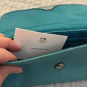 NWOT Coach large flap wristlet. Turquoise color with silver Coach on front flap. Back pocket too. Super cute!!