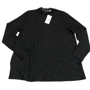 Elegant long sleeve sweater top with metallic lace details on collar and cuffs, offering a stylish and sophisticated look. Light waffle knit. New without tags.