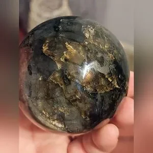 Absolutely stunning large labradorite sphere with beautiful colors and patterns. Has a beautiful dark surface and beautiful blue flash. It is approximately 65mm wide. Don't miss out on this beautiful sphere.