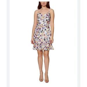 Betsey Johnson floral print dress, ruffled hem, sleeveless, adjustable straps, fitted through the chest and waist, structured A-line skirt sits slightly over the hips, stretchy and supportive.