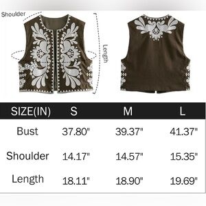 embroidered floral print, sleeveless design, open front, and cropped length, boho vests