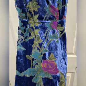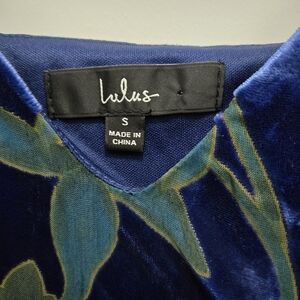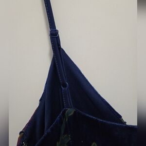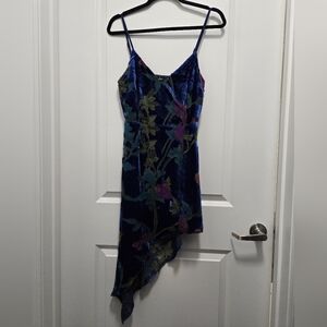 This is a Lulus Evening With You Dark Blue Floral Velvet Asymmetrical Dress Size S. It is in EUC. I see no rips, tears, or discoloration. The bottom edge is asymmetric. The dress is lined. The flowers are a purple color and leaves in blues and greens. The measurements are: arm pit to arm pit, 16 inches, length from back to longest point, 37 inches, shortest point 22 inches. There is a side zipper, and the straps are adjustable. It is a very cute evening dress for those special date nights.