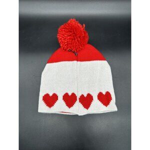 Sock Hat Hearts Pom Pom Beanie Red Hearts White Color Block Fluffy Womens Cute. This is an adorable sock hat with a big Pom Pom on top. It has the original tag attached. There are no rips, tears, or stains. Please see the pictures for the full description.