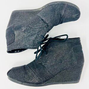 These TOMS wedge booties combine a sleek black metallic silvery denim finish with comfort. Perfect for casual or dressy looks, they feature subtle star-patterned interiors. SUPER comfy shoes, if you've never worn Tom's, the most comfy wedges I've ever put on!