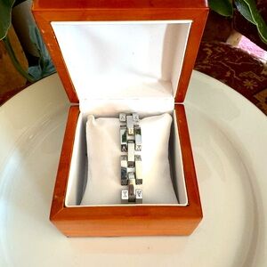 Substantial in weight & design. The initials “A & E” engraved on the side of each link. It’s a little too big on me now & has been packed away for at least 20 years & recently unearthed. Very good vintage condition, a few scratches here & there but faint. Wooden box is for display only & not included.