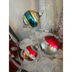 These are 3 striped Christmas balls, they are vintage and show some slight signs of wear; will look really pretty on your vintage tree, or in a bowl of vintage ornaments, these are standard size; I have a lot of vintage ornaments listed; happy to do a bundle price - one day shipping!