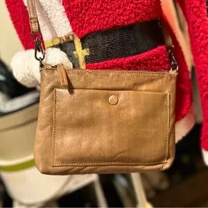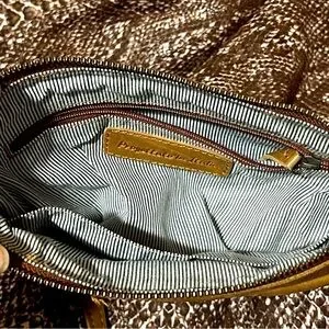 Incredibly soft leather, outer magnetic closure pocket. Navy pinstriping inside with zipper pouch