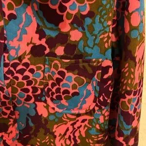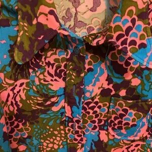 Shirt dress with colorful floral pattern. 4 button closure and sleeves. No material tag but synthetic with stretch.