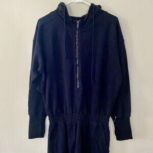 So versatile and sporty, this laidback jumpsuit is featured in a relaxed fit and soft cotton fabrication with a hooded neckline and zip-up front.