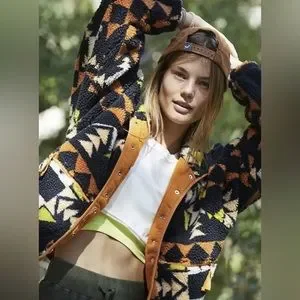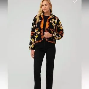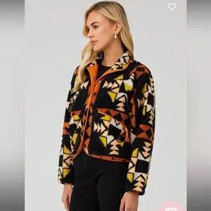 Staying warm and standing out just got easier in this nubby, brightly printed fleece jacket referred to as the “Rocky Road Jacket” from FreePeople Movement in color Night Sky