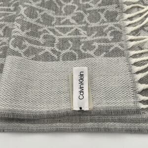 New! Calvin Klein soft gray and white acrylic CK signature logo scarf