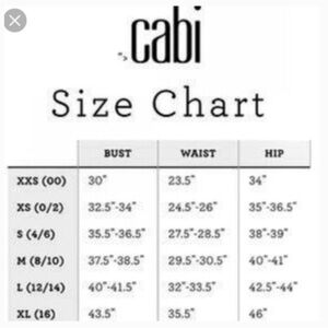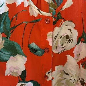 Cabi calls this romantic floral print “Valentine Floral”. It’s a fun mix of bright orange, shades of green, cream, and a subtle pop of lavender. This cute top features a scoop neckline, racerback design, and a notched hem. It buttons up the front, hits at the high hip, and has shirring in the back for a gentle drape.