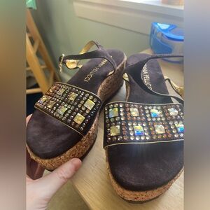 These are the holy grail Y2K shoe. Italian made. Stefania Pellicci. Cork wedges. Beautiful quality. Heavier than cheap wedges without being too heavy.