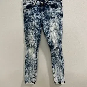Vintage acid washed with big holes in the knees and smaller holes in various other areas.