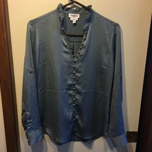 Express blouse. Great condition. V neck, embellished with a row of buttons down the front. Long sleeve cuffed wrists with button inclosure with roll up buttons mid sleeve. Made in Indonesia. 100% Polyester.
