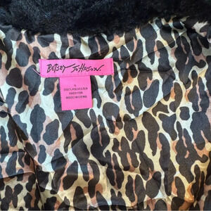 Get ready to turn heads with this stunning Betsey Johnson vest. The shaggy faux fur design is perfect for any Y2K or retro party. The vest features a hook and loop closure and is made with a polyester lining for added comfort. The black color and large size make it versatile for any occasion. The vest is perfect for women who want to channel their inner rockstar and add a touch of glam to their outfit.