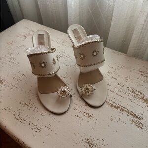 Step out in style with these elegant white heeled sandals with gold accent trim and flowered toe ring. Perfect for any occasion, these shoes offer chic sophistication.