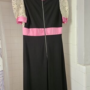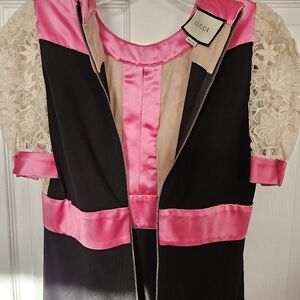 Gorgeous & authentic GUCCI cocktail dress. Small SIZE 0 or formal fitted 2. Creme colored Lace top w/hot pink Silk bow & trim that was worn only once to a wedding. Bust/neck area opens up when on exposing bra & cleavage but 'eye & hook' clasp can be sewn on to minimize exposure.