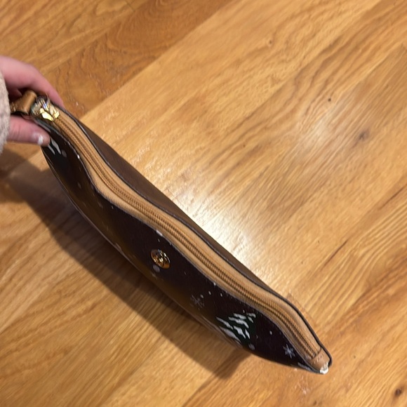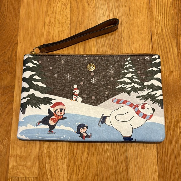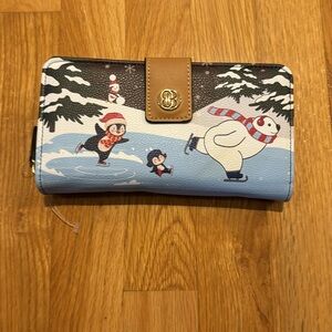 Set of 2. Wallet and a pouch. The wallet fits nicely inside the pouch. Wallet is 8 inches by 4 inches and the pouch is 11 inches by 7 inches. Both display the same scene of penguins and a polar bear skating and a penguin rolling a snowball. Priced to make money, but offers are welcome!