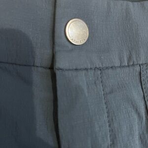 Front side pockets and back pockets elastic waist around sides and back. Front button closure was zipper lightweight material.