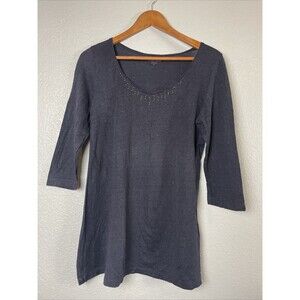 Eileen Fisher 100% Linen Top Sz PM Navy Blue Tunic Lagenlook Minimal Beaded