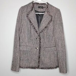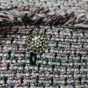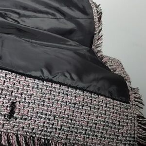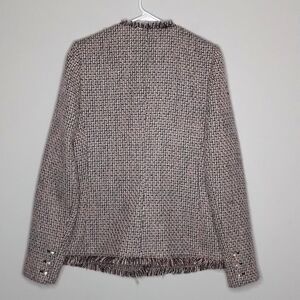 In excellent condition, the pockets are still stitched. Karl Lagerfeld boucle tweed jacket size 6 in a weave of pink, black, white and grey. Chanel-style with fringe trim and crystal-encrusted buttons, fully lined in black satin.