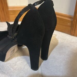 Rich black suede platform Mary Jane style heel. Ankle strap spa are contrasting croco look. Perfect for upcoming holiday events.