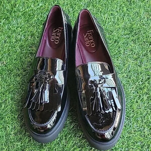 Franco Sarto glossy faux patent leather platform loafers with tassel.