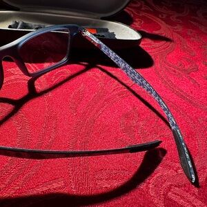 Dark blue frames with blue logo design on the inside. Case included. (Prescription lenses will need to be removed of course)