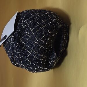 Black and gold fashion hat by Anne Klein. Brand new, never worn. Adjustable velcro closure. One size fits most. Gold Anne Klein hardware on the side of hat. pictures show all the detailing. Tweed material.
