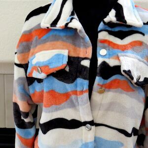 Cute and soft as a hug! This Shein cropped plush fleece jacket is soft and snuggly. Silver button closures with button pockets over each breast. Poly/spandex blend. Machine wash/dry. Approx measurements laid flat: length 17" sleeves 19" chest (pit to pit) 20".