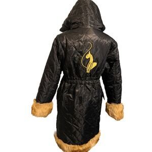 Elevate your winter wardrobe with this designer Baby Phat puffer jacket. The black long coat features a fur trim, zipper and embroidered logo accents, and a hooded design. The full zip and removable hood make it perfect for both travel and casual occasions. The jacket also comes with pockets, making it practical and functional for everyday wear.