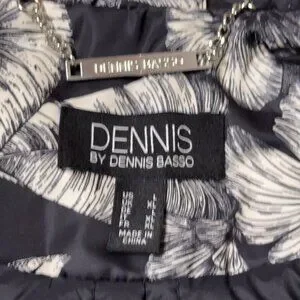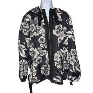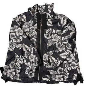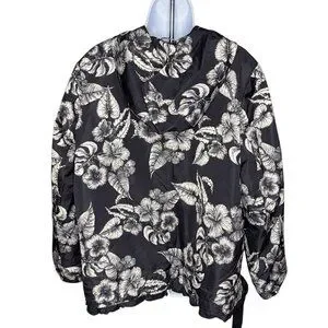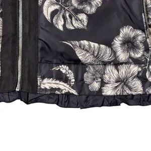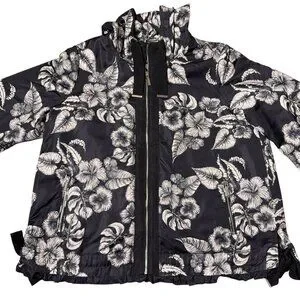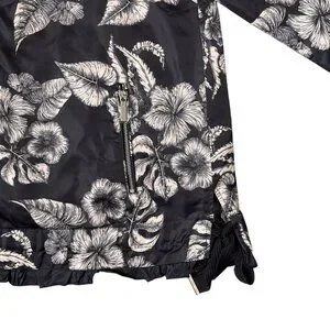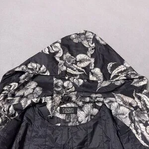 Dennis Basso Jacket Printed Floral Black White Water Resistant Hooded Ruffle Lg