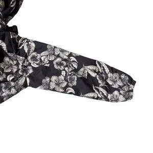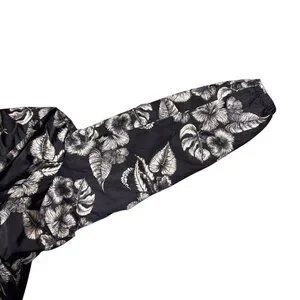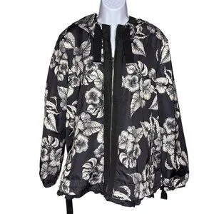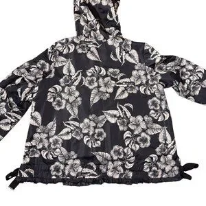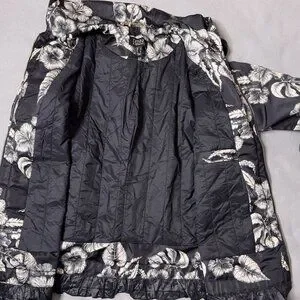 Dennis Basso Jacket Printed Floral Black White Water Resistant Hooded Ruffle