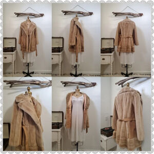 Vintage Tan Fur Suede Large Collared Avant Garde Boho England Trench Wrap Coat
