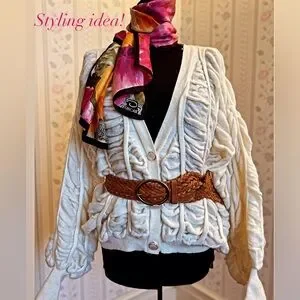 Make an impression with this gorgeous white knit cardigan! Soft and comfy knit, large flowy sleeves. Scarf and belt sold separately