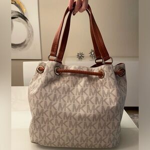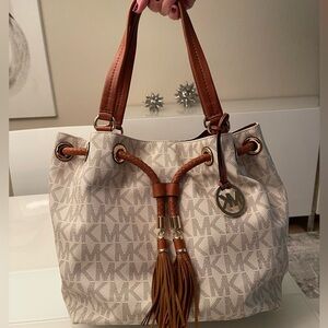 Brand new with tags! This stunning Michael Kors drawstring tote features the signature MK logo print in a chic cream and brown color combination. Accented with gold-tone hardware, braided leather details, and playful tassels.